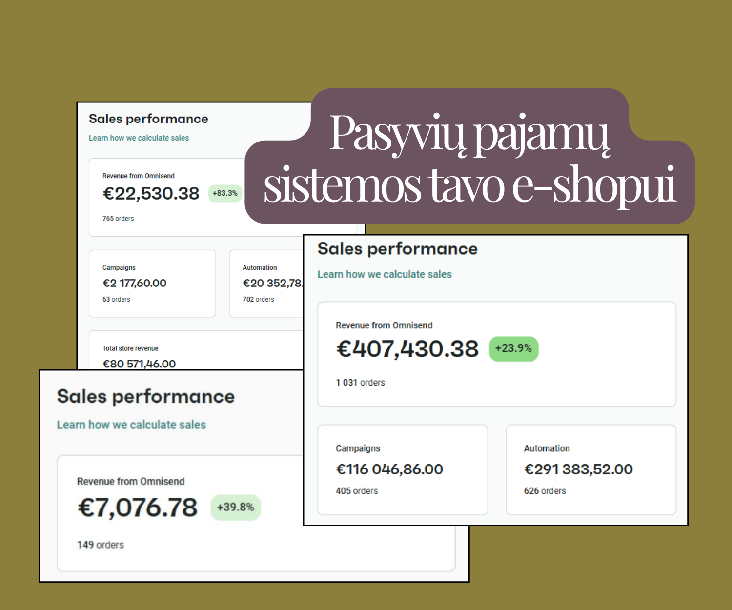 • paruoštas ir veikiančias 4 automatizacijas (pasisveikinimo, palikto krepšelio, peržiūrėtų prekių ir palikto checkouto),